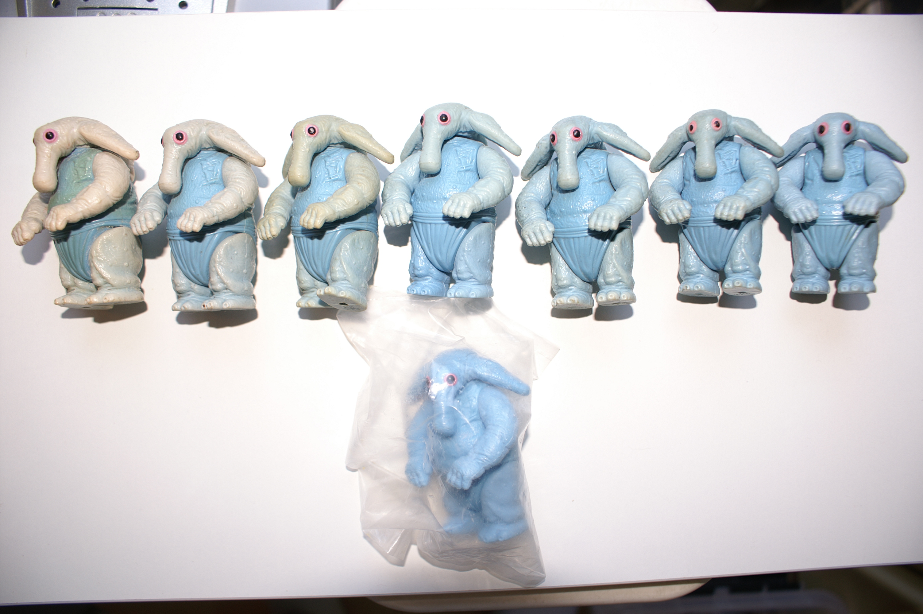 Here you can see the many forms of Max Rebo. Although I know of no major variation, I do see many discoloured versions being sold for C8+ ratings. Don't let people fool you, he should be totally blue as you can see with the baggie version at the bottom. Anything less than this is NOT C9+